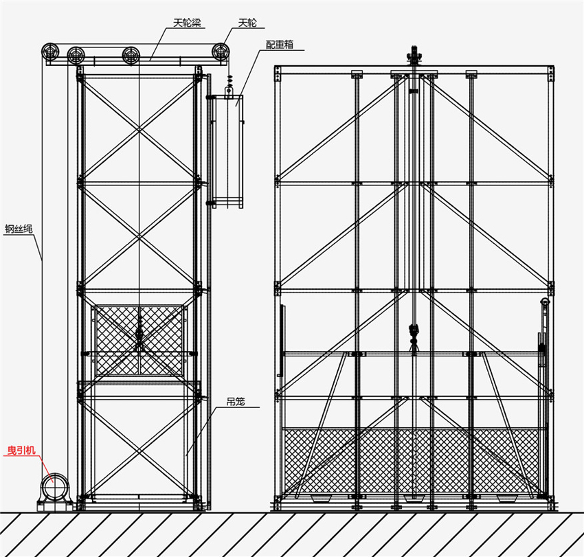 提高載重量。利用曳引機(jī)實(shí)現(xiàn)吊籠升降的升降設(shè)備工作原理與客梯類似,在井架一側(cè)裝有配重與吊籠自重相互抵消。進(jìn)而提高了載重量。
